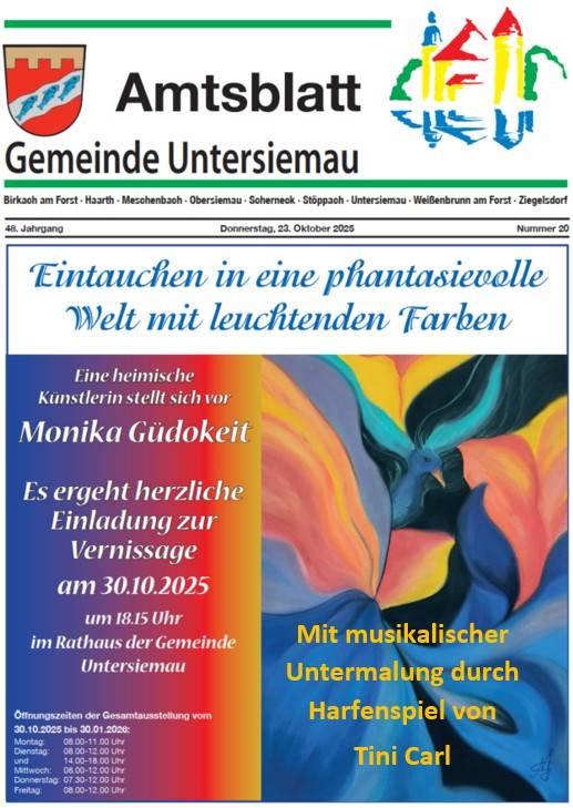 Im Vorfeld der heutigen öffentlichen Gemeinderatssitzung findet die Eröffnung der Ausstellung von Monika Güdokeit statt. Kommen Sie vorbei und tauchen Sie in eine phantasievolle Welt ein.