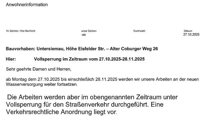 Aufgrund Arbeiten an der Wasserleitung muss ein Teil der Straße Alter Coburger Weg voll gesperrt werden. Nähere Informationen können Sie dem Schreiben der Firma STL Sonneberg entnehmen.